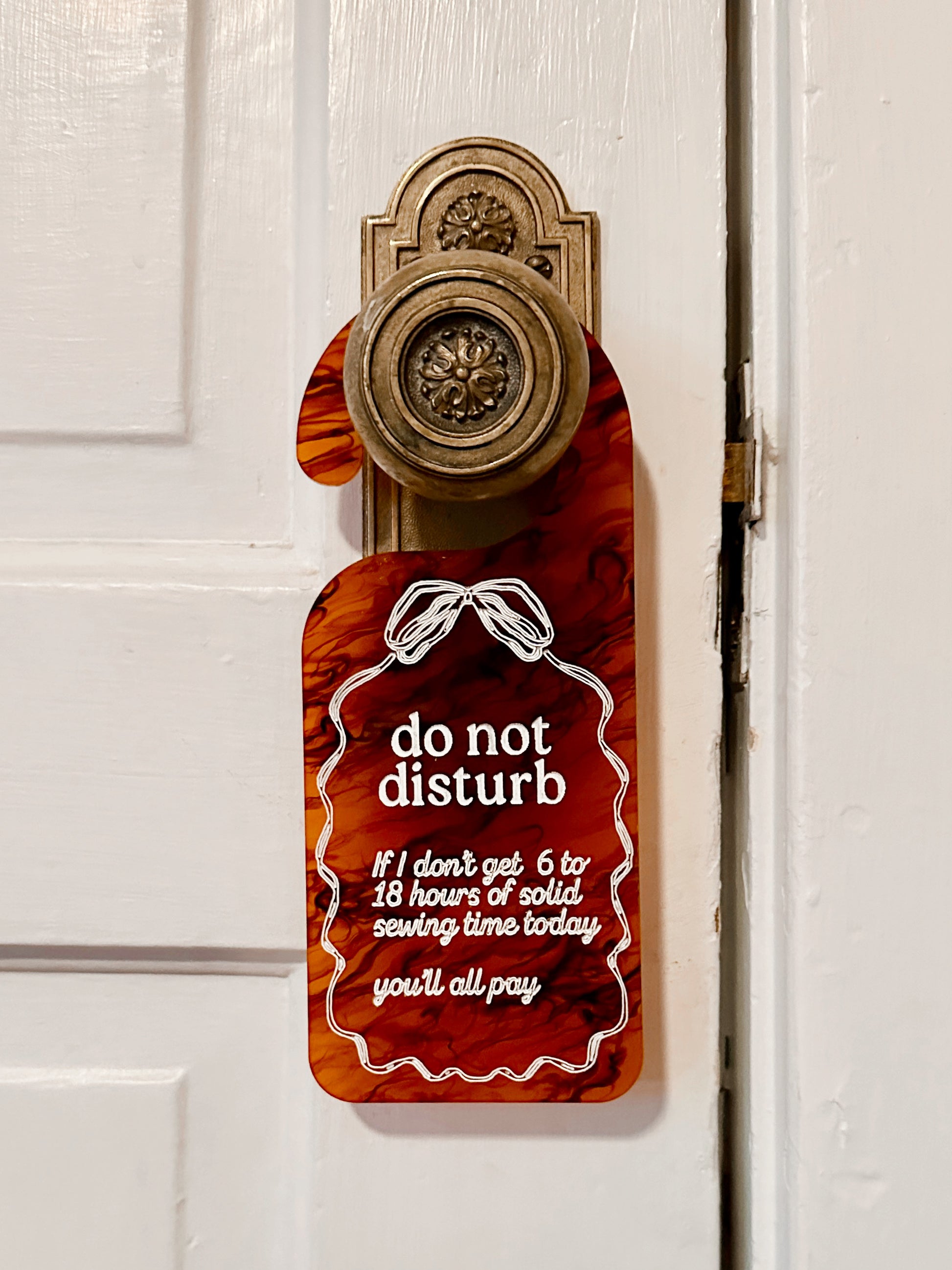 Let your loved ones know that you need to sew with a gentle threat! Door hanger made of 3 mm acrylic with engraved, enameled details. Measures approximately 7.75" by 3.25".