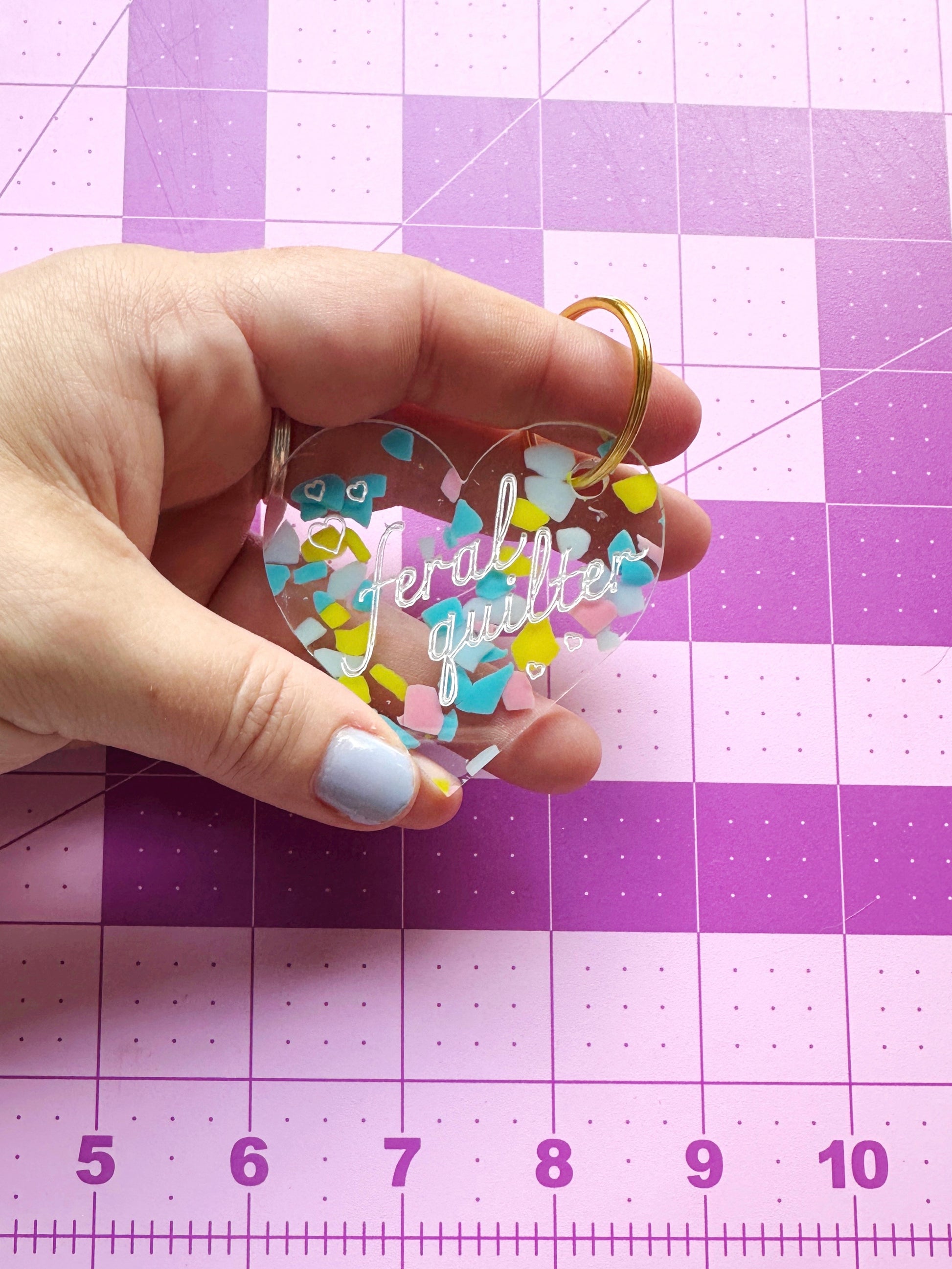 Your bag called. She wants some feral swag! These "feral quilter" keychains are made from the leftovers, duds, and scraps of our other products. Because a true quilter always uses her scraps! Measures approximately 2.5", with a gold colored keyring and clip.