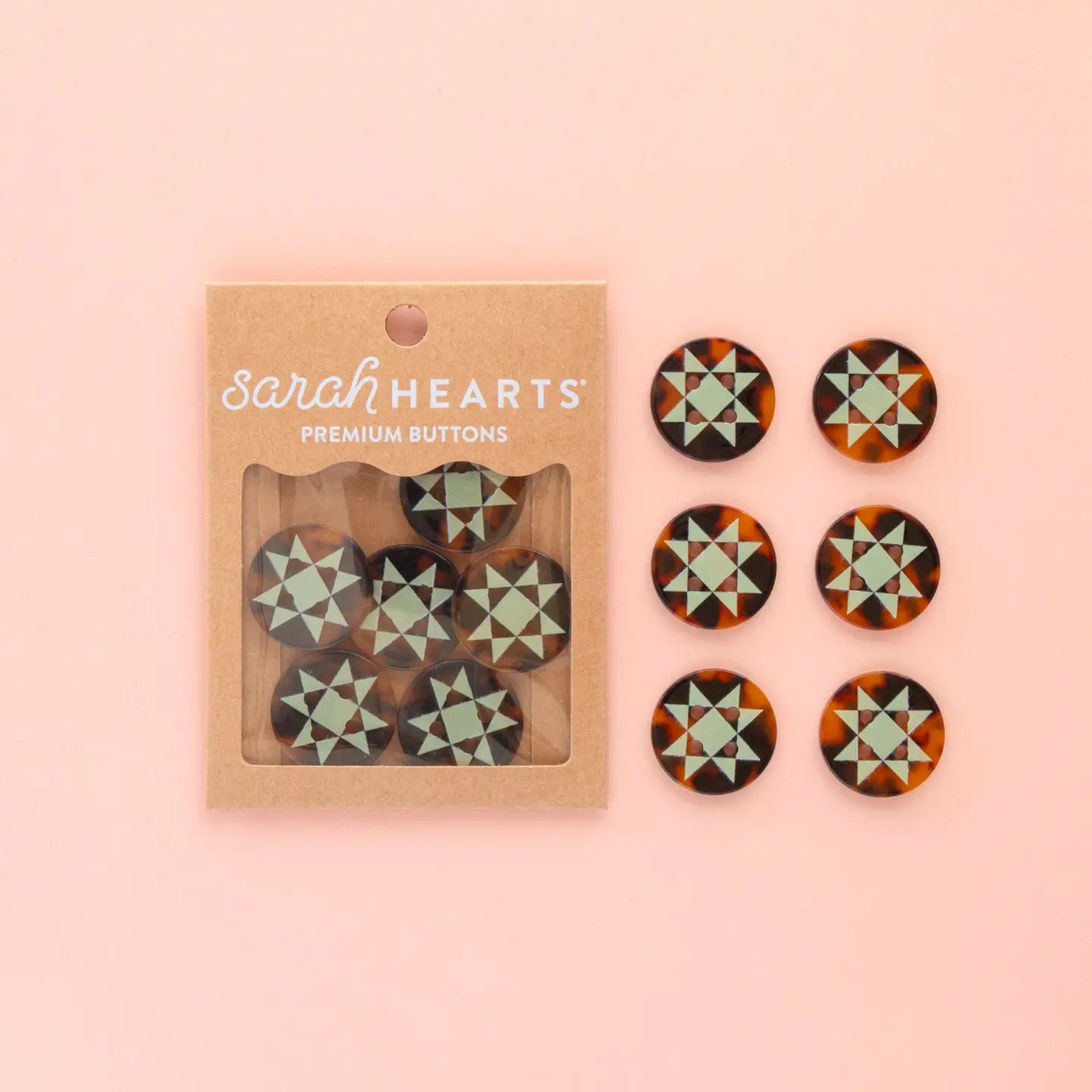 Add some quilty charm to your projects with these Large Quilt Star Buttons. Made from eco-friendly cellulose acetate, each button features a round tortoise shell design topped with a crafty cream printed quilt star. They're the perfect cheerful accent to brighten up any garment or bag. Sold in packs of 6 buttons.