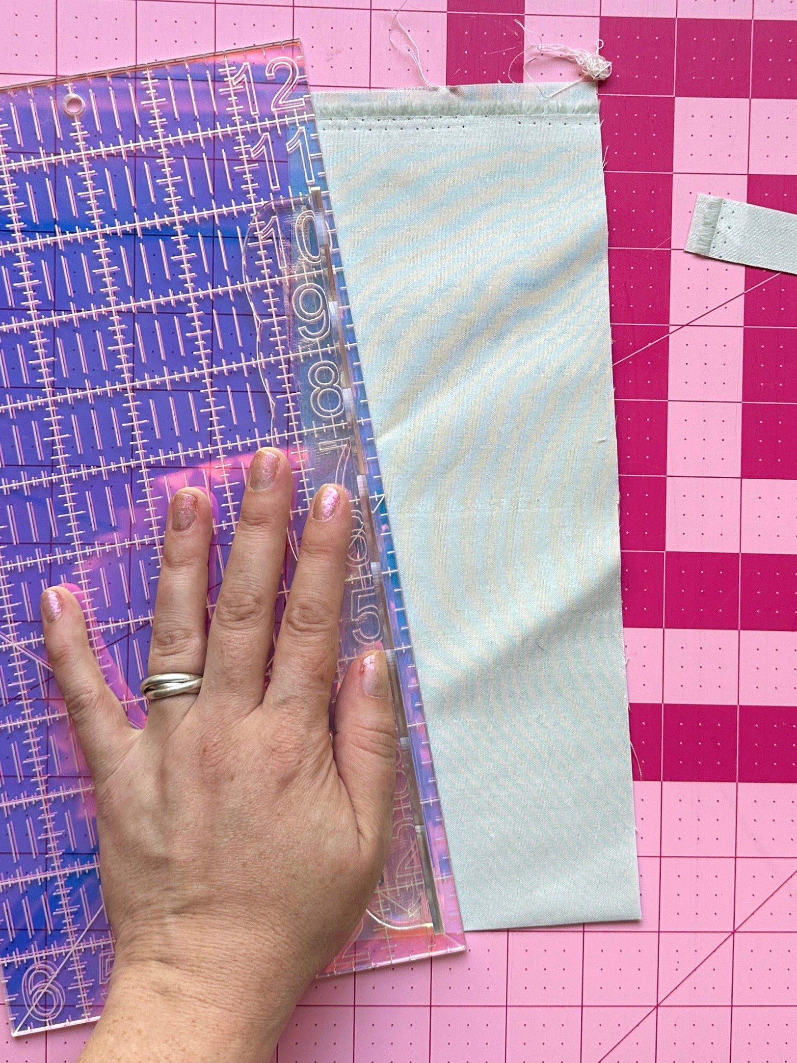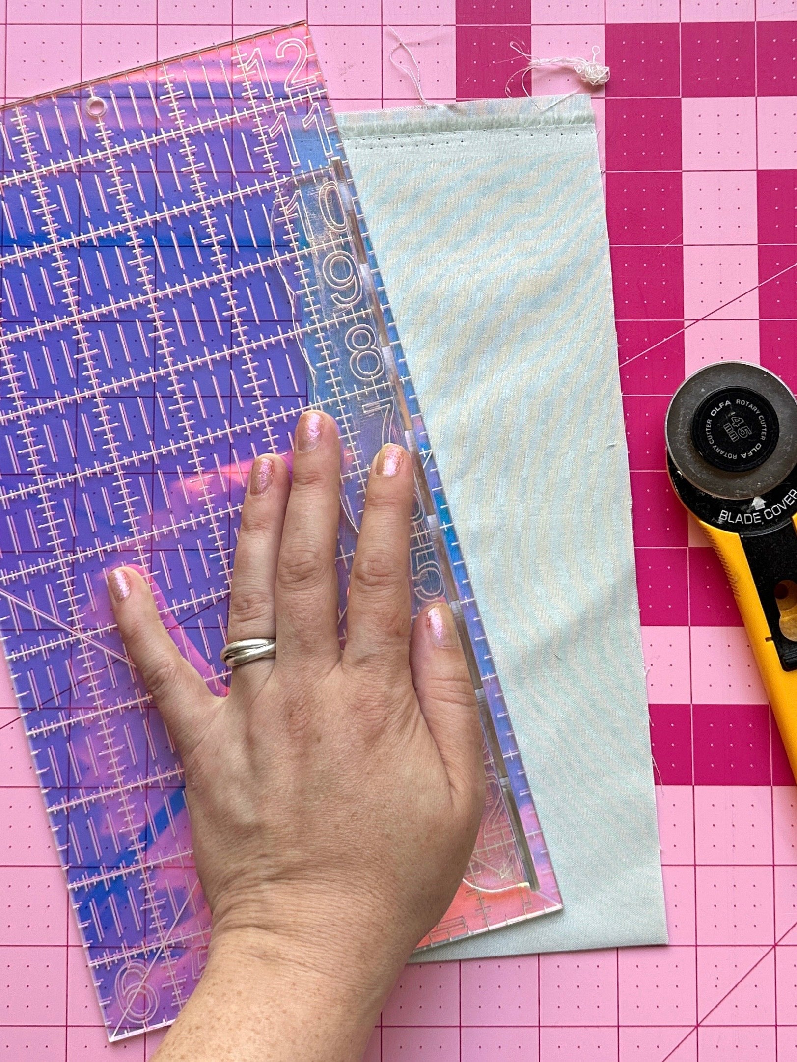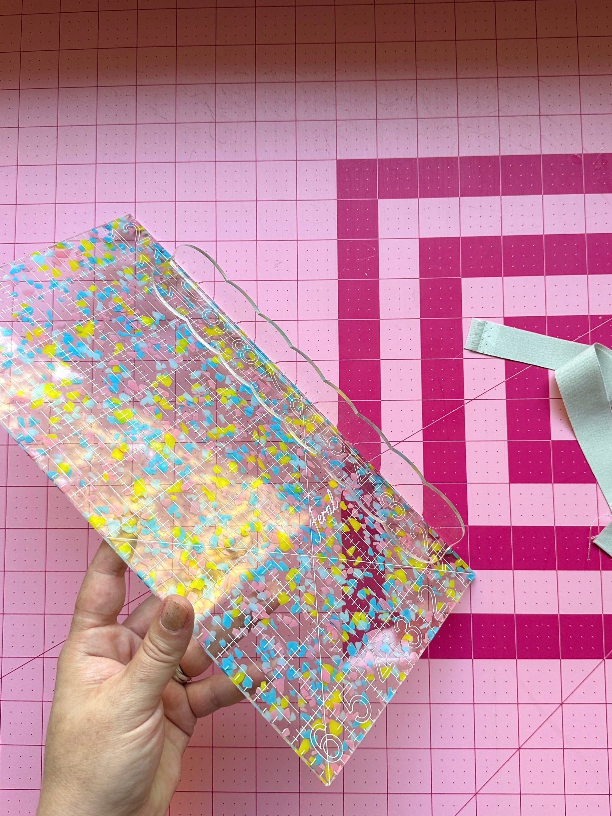 Protect your precious fingers! Our stick-on ruler edge guard protects your fingers from injuries caused by rotary blades. Apply the adhesive-backed edge guard near the edge of your favorite large ruler (works best on our 6 x 12 and fat quarter sizes), and cut fabric with confidence. Measures 9.5 inches long by 1 inch wide and 1 inch deep. Features a cute scalloped design (no straight lines means it won't interfere with measurements).